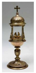 Fregi e incisioni: piede a sezione circolare con orlo leggermente inclinato e modanato,, desinente in una gola liscia, saldato sotto il corpo del piede che aggetta con una fascia bombata e baccellata delimitante il campo puntinato, fusto composto da due nodi minori a disco decorati l'inferiore da un leggero motivo a ovoli il superiore da tacche verticali che racchiudono un nodo centrale "ad oliva" con modanature verticali e fondo puntinato. Il sottocoppa è liscio con labbro decorato da una fascia bombata e baccellata, teca formata formata da quattro montanti a foggia di contrafforte con estremità a doppia voluta, piattello interno con cespo fogliaceo, coperchio con fascia e calotta a bulbo con campiture triangolari delimitate da fasce lisce, file di embrici digradanti, desinenti in foglie pendenti, balaustrino con crocetta apicale latina con terminazioni trilobe.