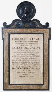 Lapide fatta da marmi diversi con iscrizione, inserita in una cornice. Sopra il lato superiore è presente un medaglione bronzeo