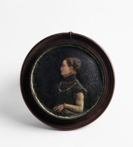 Piccolo rilievo tondo con il busto di profilo di una figura femminile, dotato di cornice