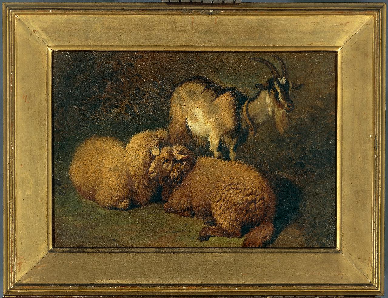 Capra ritta con due pecore a riposo. capra ritta con due pecore a riposo