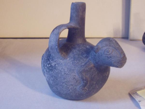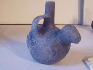Bottiglia con beccuccio e ansa a ponte. testa di felino