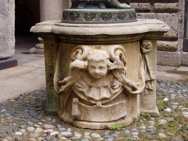 piedistallo che oggi sostiene una statua novecentesca; l'oggetto è composto da due piedistalli montati fronte e retro dotati della medesima decorazione