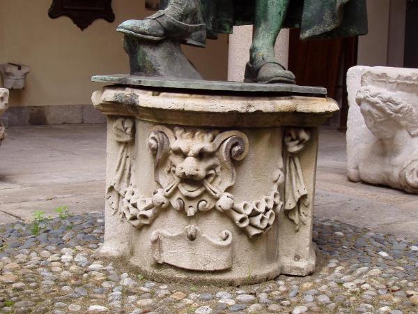 piedistallo che oggi sostiene una statua novecentesca; l'oggetto è composto da due piedistalli montati fronte e retro dotati della medesima decorazione