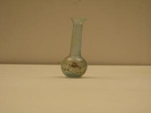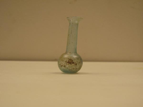 balsamario con orlo obliquo, tagliato e arrotondato, collo cilindrico, corpo sferico su base appiattita