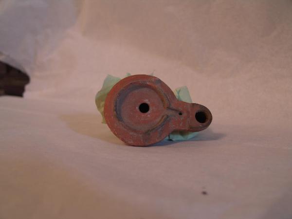 Firmalampe, lucerna composta da disco liscio con foro di alimentazione rotondo al centro; borchia sulla spalla, il cui anello a rilievo si interrompe nel canale costituito da una linguetta triangolare munita all'estremità di un forellino per l'aria
