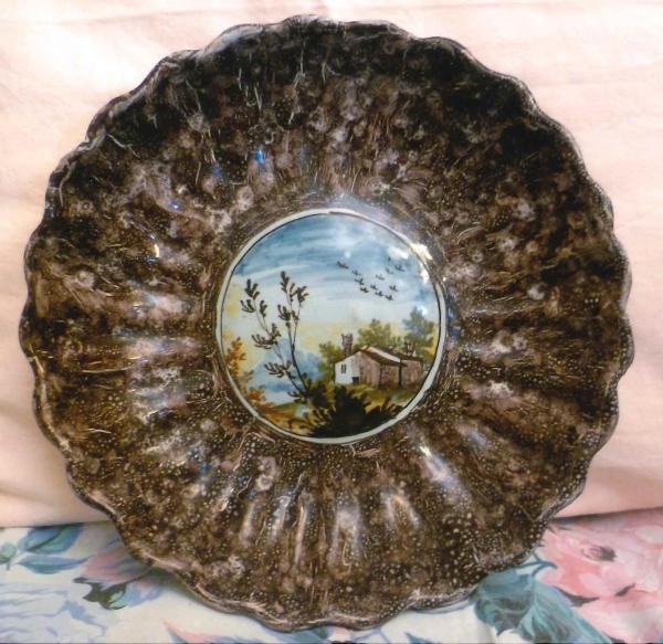 Piccolo bacile con bordo manganese, paesaggio con castello