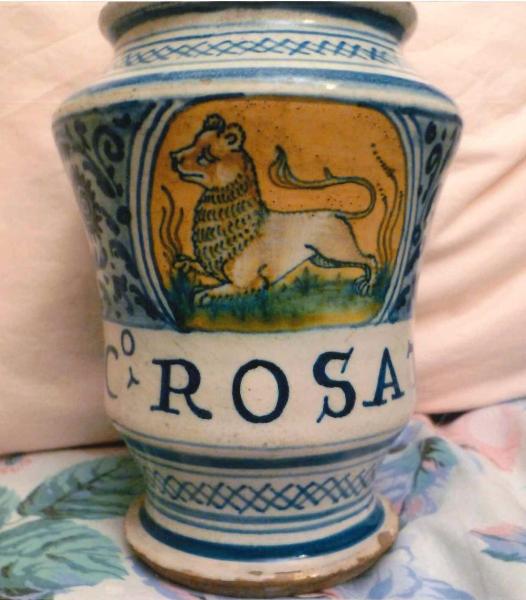 Albarello con decoro alla porcellana con leone e cartiglio
