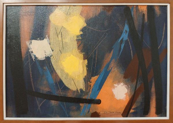 Composizione astratto-lirica costituita da un fondale sfumato nero-arancio, attraversato da pennellate blu, gialle, bianche, nere e rosso-brune di varie forme, ampiezza e direzione.