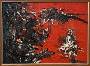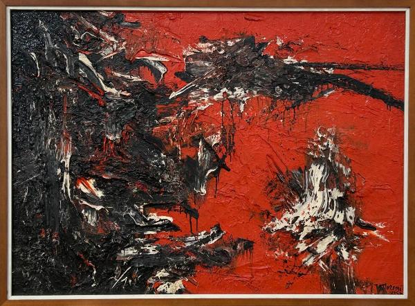 Composizione informale su fondo rosso con pennellate materiche bianche e nere.