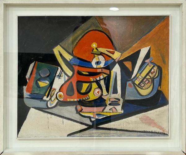 Composizione neocubista caratterizzata da forti pennellate nere e forme in bilico tra iconico e aniconico che sembrano affastellarsi su un piano di appoggio. Gli elementi sono eterogenei e dipinti nei toni contrastati del rosso, blu, giallo, bianco e nero, su un fondo costituito da diverse campiture: nero, ocra, marrone, arancio, bianco.