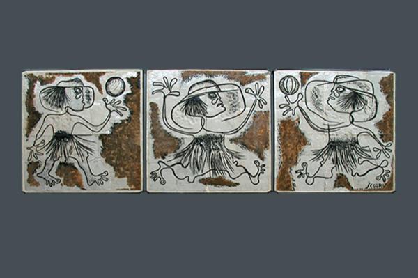 Trittico formato da pannelli a bassorilievo e a graffito. Ceramica smaltata a fuoco e invetriata. Intelaiatura di ferro.