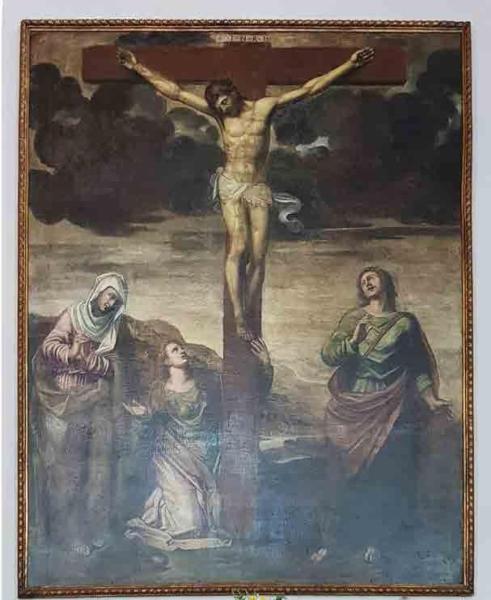 Lo spazio occupato dall'imponente dipinto è quello centrale, con sviluppo verticale, che va a dominare l'intera abside e la navata centrale della Chiesa. Il Cristo in croce occupa il centro del dipinto e si sviluppa in tutta la metà superiore, inferiormente Maddalena con i capelli sciolti sulle spalle aggrappata alla croce, inginocchiata su stessa con lo sguardo rivolto verso l'alto, una Vergine anziana sulla sinistra, nel classico gesto a mani congiunte e lo sguardo opposto alla Maddalena e dunque rivolto verso il basso, ed un contrito san Giovanni sulla destra, che osserva esterrefatto il Cristo nella stessa direzione della Maddalena. Lo sfondo silenzioso emana una luce nel centro: superiormente ed inferiormente si instaura un equilibrio cromatico tra due note scure date dal terreno su cui poggiano le figure e la croce, ed il cielo alto nuvoloso e imbrunito. La tavolozza impiegata si basa sul contrasto tra i bruni e la gamma delle terre, totalmente dominanti e i colori freddi e decisi delle vesti delle donne e del san Giovanni: le prime hanno in comune questa lacca violacea, di cui si ha un accenno carico di ossidi di ferro sulla tunica del san Giovanni, di colore verde piuttosto brillante.