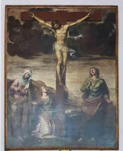 - NOTIZIE STORICO CRITICHE Le scelte formali e la restituzione anatomica delle figure rimandano fortemente ad un manierismo lombardo che trova una sua riflessione diretta nelle esecuzioni di Simone da Peterzano, in particolare nel celebre ciclo pittorico della Crocefissione nell'area absidale della Certosa di Garegnano, con le figure isolate della Vergine e di san Giovanni. La somiglianza fra la tela conservata a Dumenza e il soffitto a tiburio di forma ottagonale della Certosa di Milano, è notevole sia dal punto pittorico che compositivo per le posture ed espressioni dei personaggi, per i drappeggi delle vesti. La differenza compositiva risiede nella distribuzione delle figure nel tiburio: al centro abbiamo la rappresentazione della croce con Cristo e la Maddalena ai suoi piedi mentre ai lati, nei due spicchi, troviamo rappresentati specularmente il compassato Giovanni e l'anziana Maria che si rivolge verso Cristo, con lo sguardo fisso verso terra. Simone da Peterzano, maestro di Caravaggio, per questa esecuzione ad affresco impiega una tavolozza molto viva di colori ricchi e accesi, che non si riscontra attualmente nel nostro dipinto oggetto di studio, ad oggi non totalmente leggibile a causa dei materiali di restauro molto alterati e degradati, disposti al di sopra della pellicola pittorica e che hanno portato la tela ad un trasferimento su tavola nel 1992 ad opera del Lotti restauratore. L' ipotesi è che la tela, giunta al Comune di Dumenza dalle Orsoline di Milano, possa far parte in qualche modo del ciclo della Certosa merita senza dubbio un accurato approfondimento.