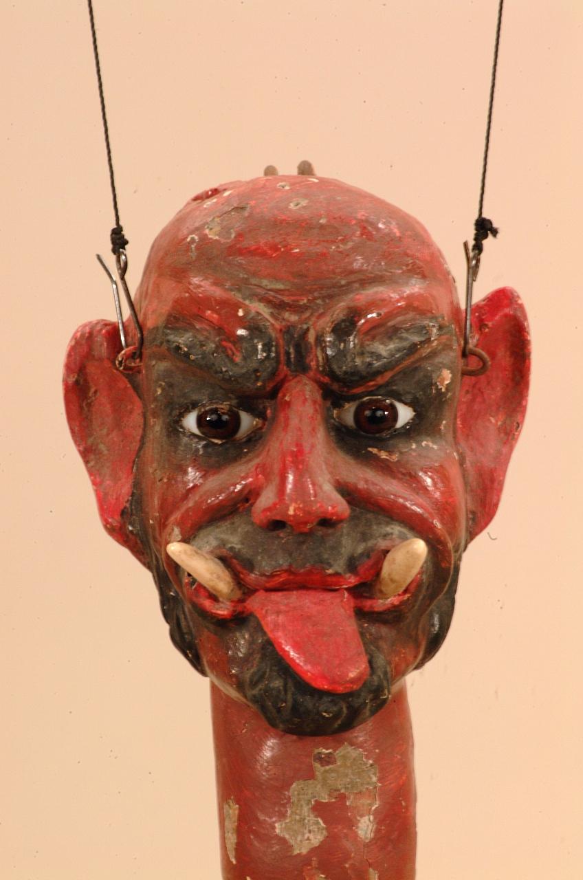 Due fori sopra la testa, erano probabilmente l'alloggio per delle corna. \nDue zanne inserite nella bocca, ottenute da corna di animale. \nAggancio ad anello sulla tetsa, utilizzato in passato per il bilancino a pugnetto.