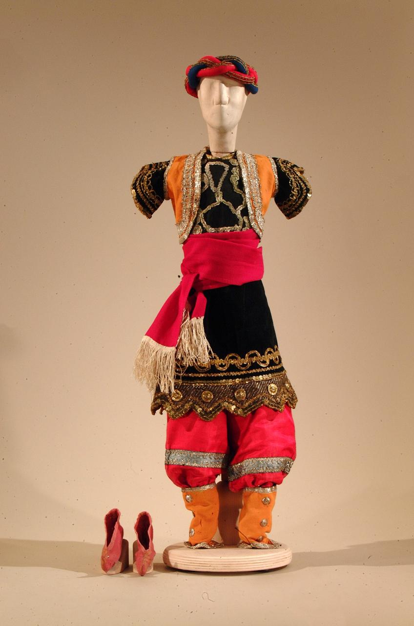 Costume per saraceno di foggia medievale composto da pantaloni, veste, bolero, cintura, uose, scarpe e turbante.