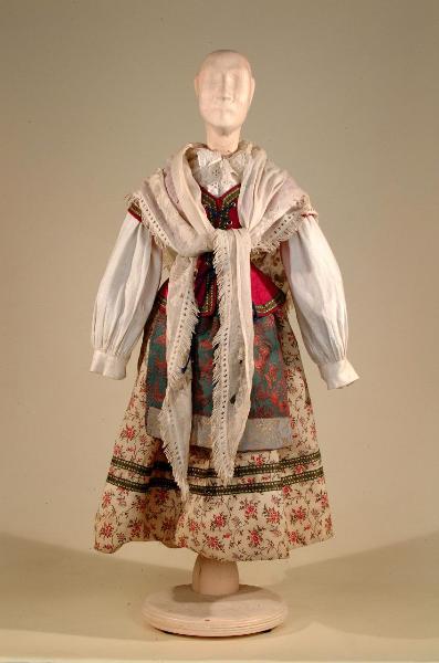Costume per contadina del '600 costituito da camicia, gonna, corpino, grembiule, scialle