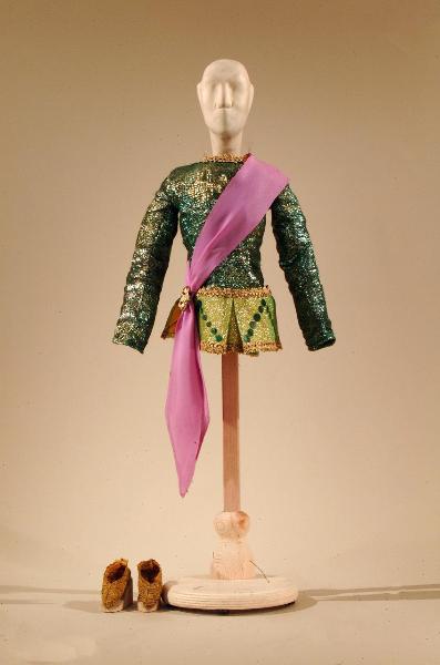 Costume per ballerino di foggia rinascimentale composto da veste, fascia e scarpe.