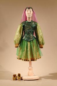 Costume per ballerina di foggia rinascimentale composto da gonna, corpino, copricapo e scarpe.