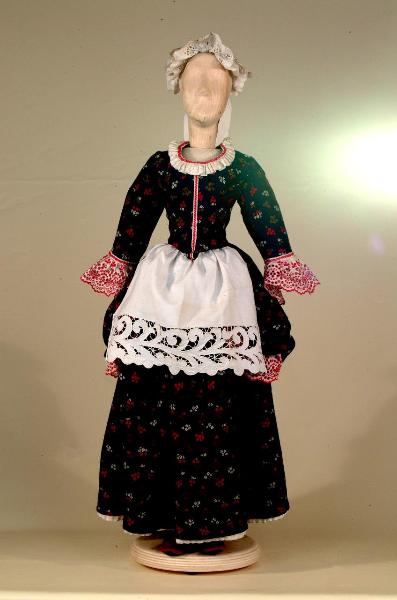 Costume femminile di tipo settecentesco costituito da gonna, corpino, scarpe, grembiule e cuffia.