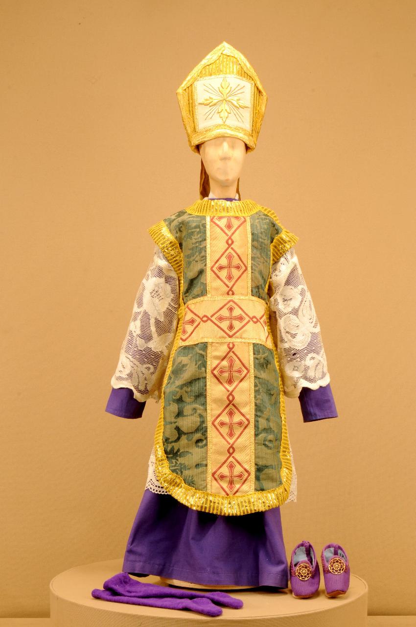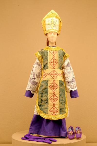 Costume di religioso per vescovo composto da veste, colletto, cotta, pazienza, calze, scarpe, e mitria.