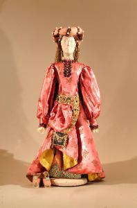 Costume per dama di foggia rinascimentale composto da veste, gonna-sottoveste, scarpe e cintura. Si completa con un cappello che ha il codice GOR 14689.