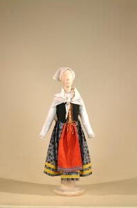 Costume di popolana del '600 per marionetta figurino costituito da veste, sottogonna, scialle, fazzoletto da testa.