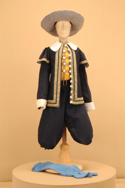 Costume da popolano di foggia seicentesca composto da pantaloni, giacca, gilet, cintura e calze. Si completa con un cappello che ha il codice GOR 07241.