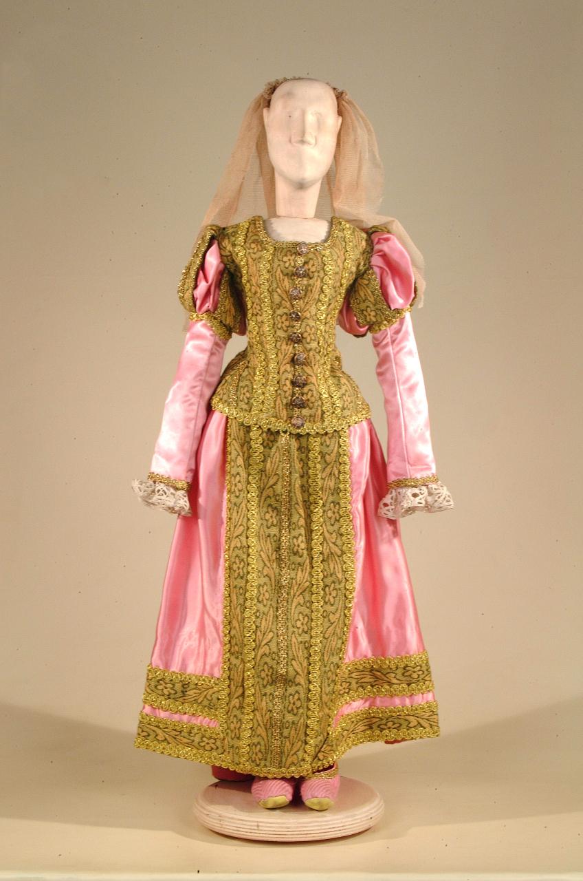 Costume di donna nobile del '600 costituito da gonna, corpino, scarpe, velo.