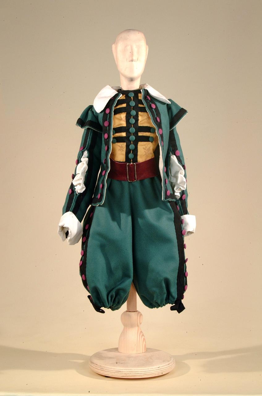 Costume di popolano del '600 costituito da pantaloni, giacca, gilet e cintura.