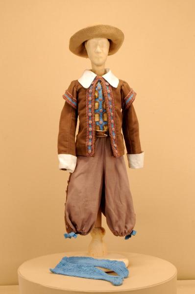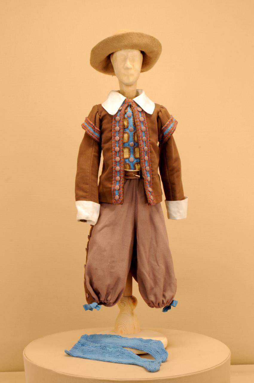 Costume da popolano di foggia seicentesca composto da pantaloni, giacca, gilet, cintura e calze. Si completa con un cappello che ha il codice GOR 07281.