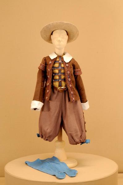 Costume da popolano di foggia seicentesca composto da pantaloni, giacca, gilet, calze e cintura. Si completa con un cappello che ha il codice GOR 15371.