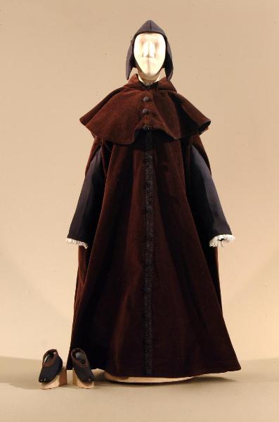Costume per borghese del 1500 composto da veste, pellegrina con cappuccio, cuffia e scarpe.
