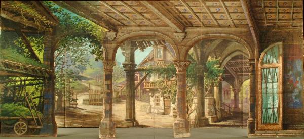 Scenografia in carta, fortezzata con strisce di tessuto di cotone, dipinta ad acqua e composta da un fondale ed un principale.