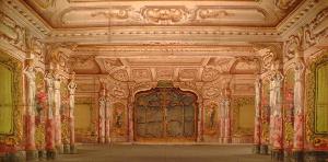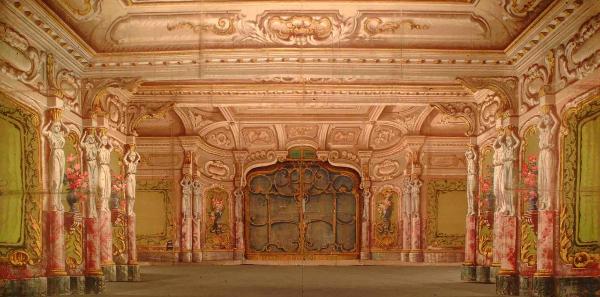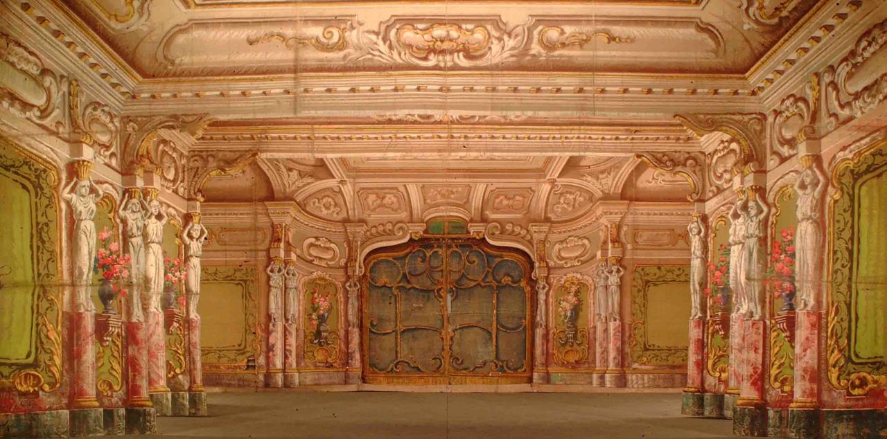 Scenografia in carta dipinta ad acqua e fortezzata con strisce di tela, composta da un fondale, due principali, due rompimenti e un fondalino.