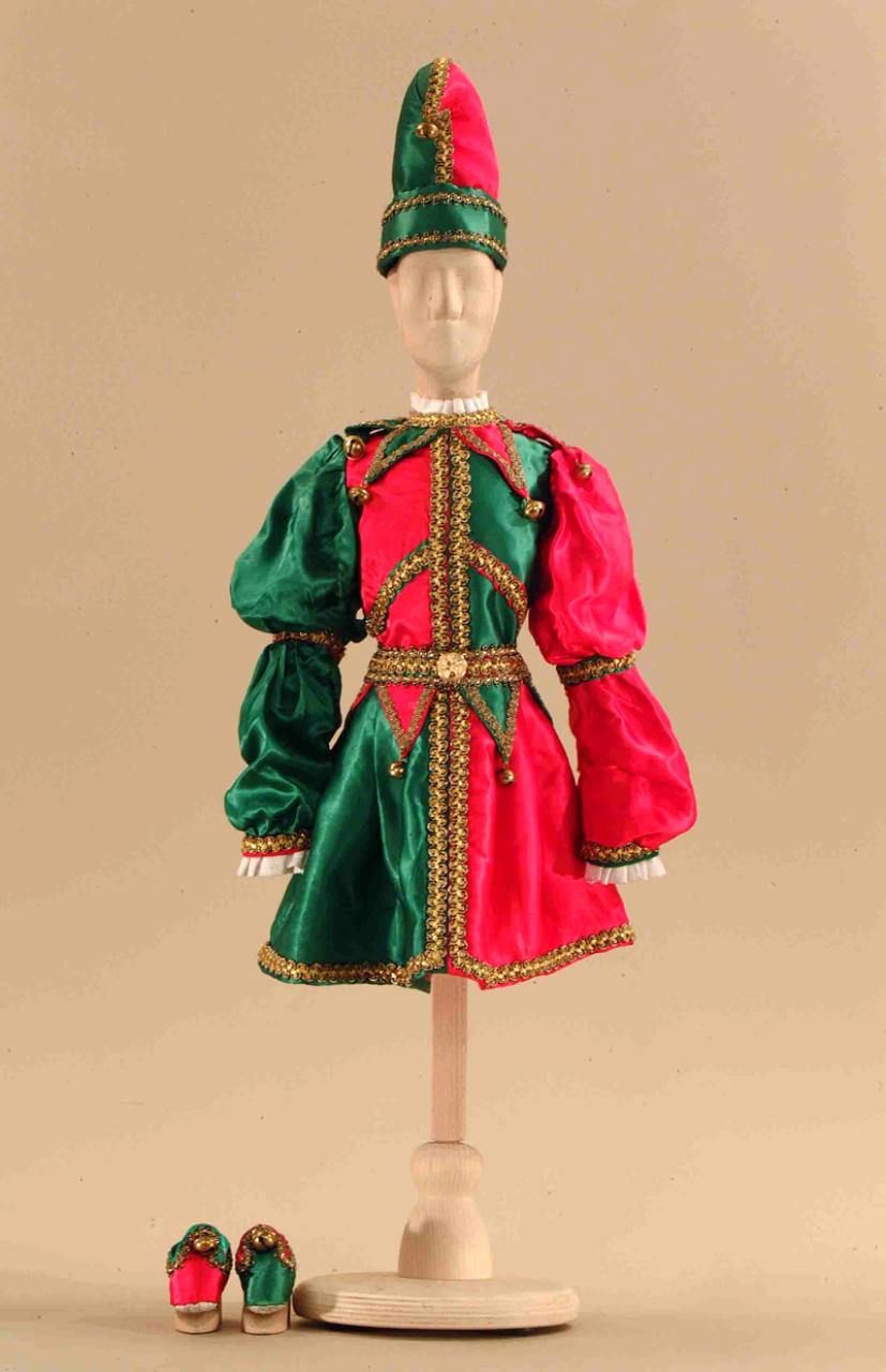 Costume per buffone inserito in contesto del 1500 composto da veste, cintura, cappello, scarpe.