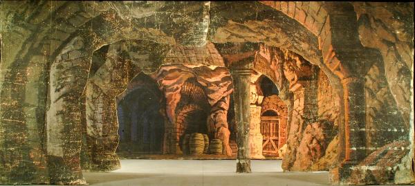Scenografia in tela dipinta ad acqua composta da un fondale e quattro rompimenti aventi forma di semi-principale con funzione di mascherare i principali della scena successiva "Finale", per simulare, a strappo, il crollo.