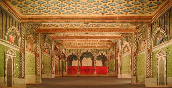 Scenografia in carta dipinta ad acqua e fortezzata con strisce di tela, composta da tre principali e un fondale. Il secondo principale viene posizionato al ponte.