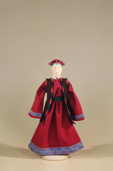 Costume da popolano '400 per figurino costituito da veste, sopravveste, cintura, cappello, collo e polsi.
