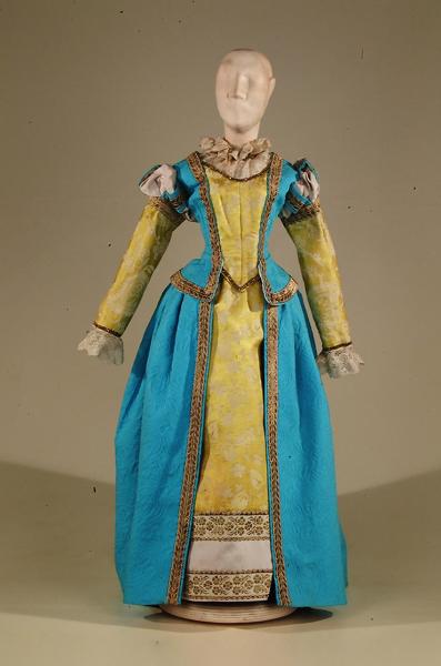 Costume per donna nobile del '600 costituito da gonna, corpino e scarpe.