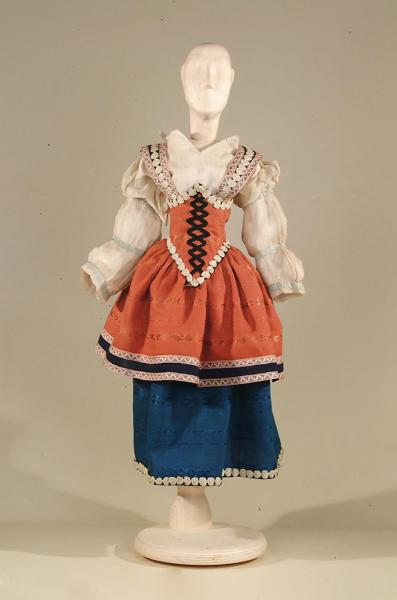 Costume per popolana di foggia cinquecentesca composto da gonna, camicetta, bustino e bretelle.