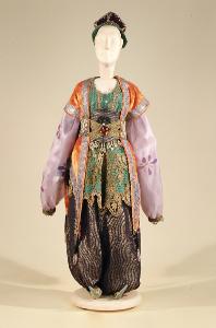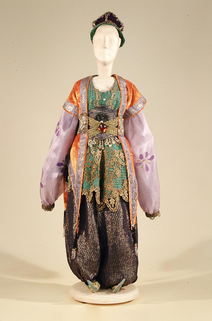 Costume femminile di nobile medio orientale composto da pantaloni, corpino, zimarra, fusciacca, scarpe e cappello.