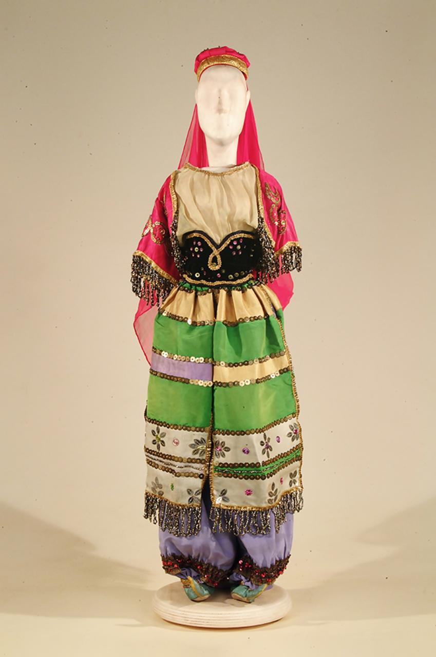 Costume femminile di nobile medio orientale composto da pantaloni, gonna, corpino, bolero, scarpe e copricapo.