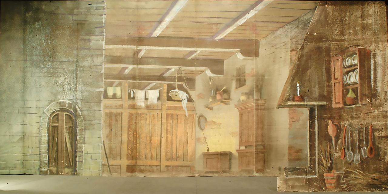 Scenografia in carta, fortezzata con strisce di tessuto di cotone, dipinta ad acqua e composta da un fondale ed un rompimento o spezzato.