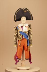 Costume fantastico composto da pantaloni, giacca, gilet, collo, fascia e cappello.