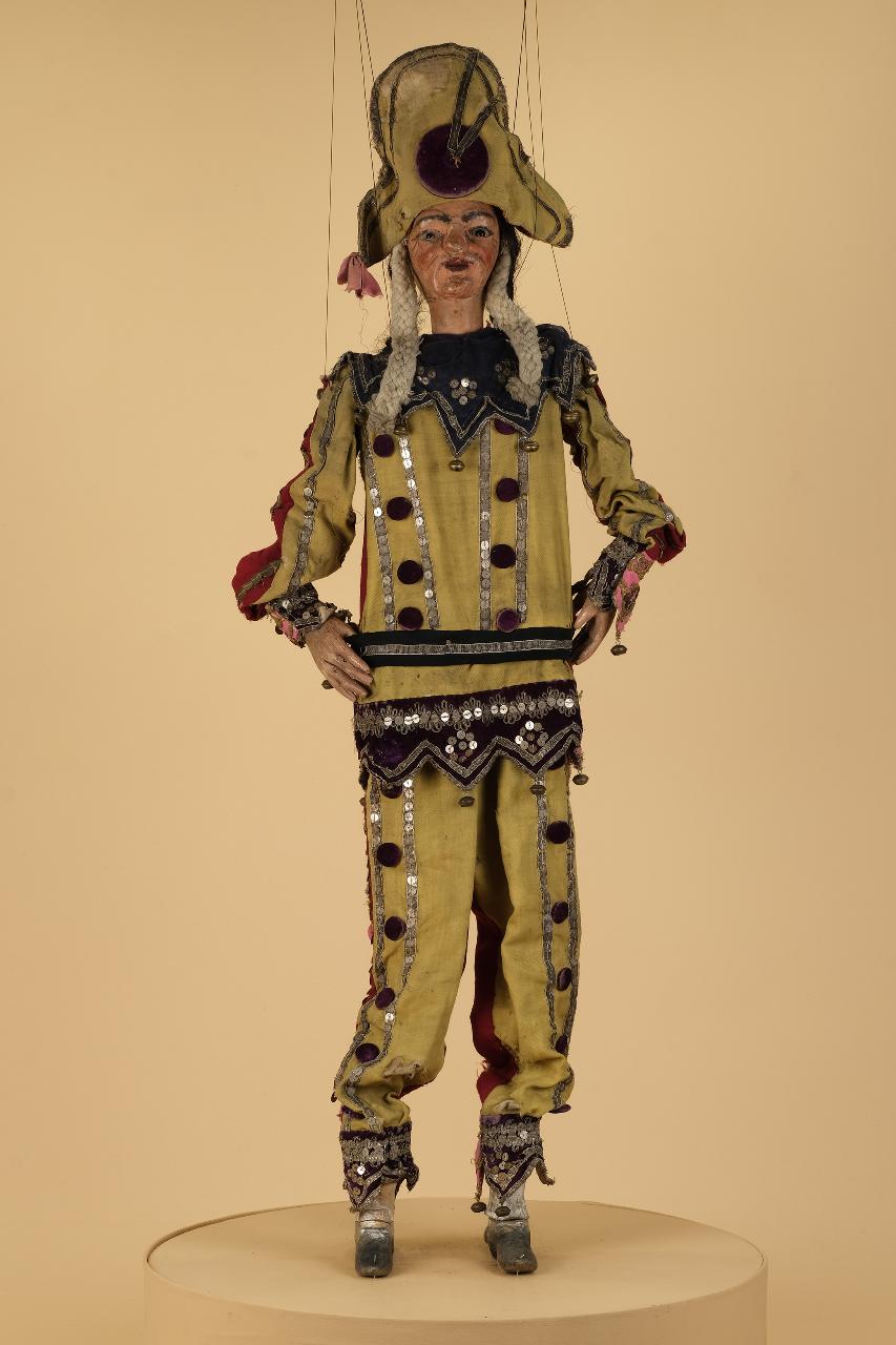 Testa in legno di tiglio bifronte, a due volti: uno allegro ed uno triste. Mani e piedi in legno di tiglio bifronti. Il corpo è costituito direttamente dal costume. L'anima in filo scorrevole permette la compressione o l'estensione del corpo modificandone l'altezza. Il costume è costituito da pantaloni smerlati, decorati da bordure, paillettes, bottoni e campanelli. La casacca è anch'essa smerlata e decorata come la parte inferiore. La vita è sottolineata da una doppia bordura che simula la fascia di cinta. La testa è rifinita con una parrucca a trecce di cotone e da un copricapo a lanterna Napoleonica decorato come il resto del costume. La marionetta è ugualmente definita sui due lati anche se quello allegro è giallo, mentre quello triste è rosso.