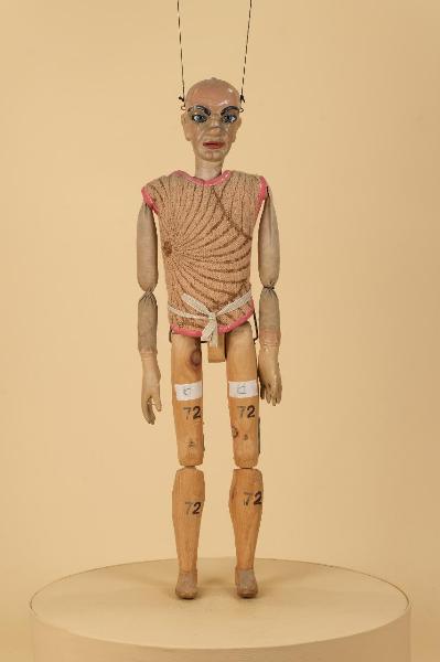 Testa in legno di tiglio fissata al corpo tramite ferro; occhi di vetro; corpo normale in cirmolo; gambe attaccate con ferro al bacino; ginocchia ad incastro; piedi piombati; mani in tiglio con dita unite. Piedi fissi. Bilancino originale da marionetta in coppia, metodo Holden.