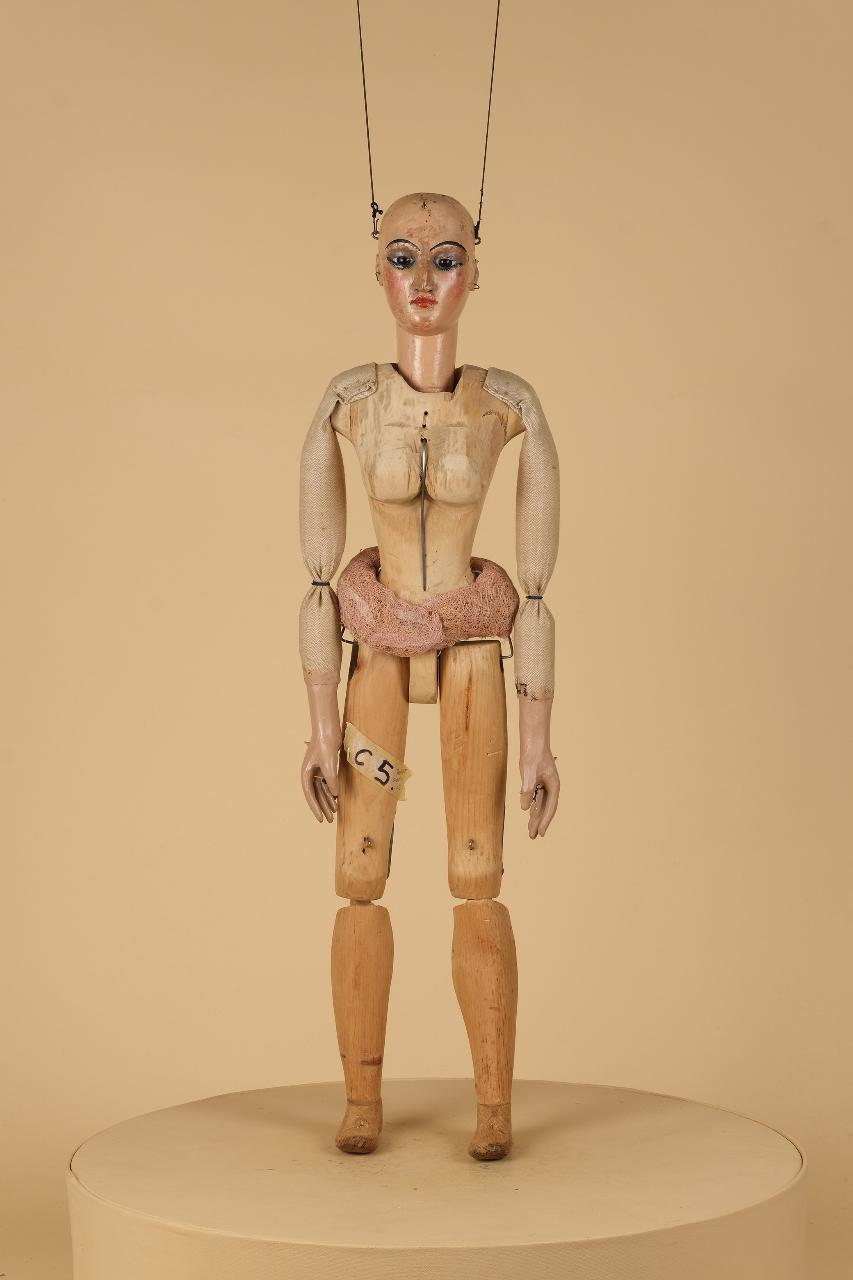 Testa in legno di tiglio fissata al corpo tramite ferro; occhi di vetro; corpo femminile in cirmolo; gambe attaccate con ferro al bacino; ginocchia ad incastro; piedi piombati; mani in tiglio con dita unite. Piedi fissi. Bilancino originale da marionetta in coppia, metodo Holden.