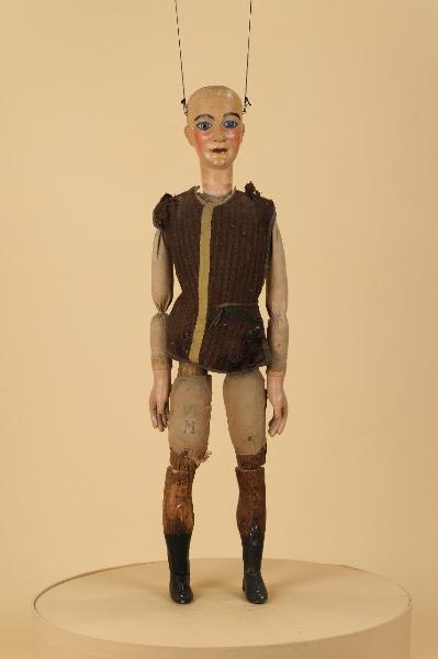 Testa in legno di tiglio fissata al corpo tramite ferro; occhi di vetro; corpo normale in pioppo; gambe attaccate con ferro al bacino; ginocchia ad incastro; piedi piombati; mani in tiglio con dita unite. Piedi pigmentati di colore scuro. Bilancino originale da marionetta in coppia, metodo Holden.