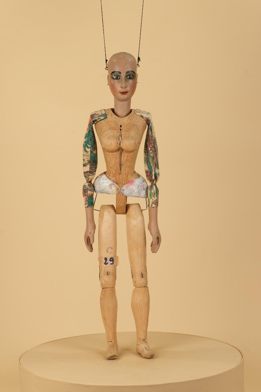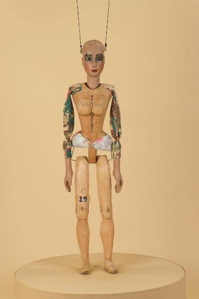 Testa in legno di tiglio fissata al corpo tramite ferro; occhi di vetro; corpo femminile in cirmolo; gambe attaccate con ferro al bacino; ginocchia ad incastro; piedi piombati; mani in tiglio con dita unite. Piedi fissi. Bilancino originale da marionetta in coppia, metodo Holden.