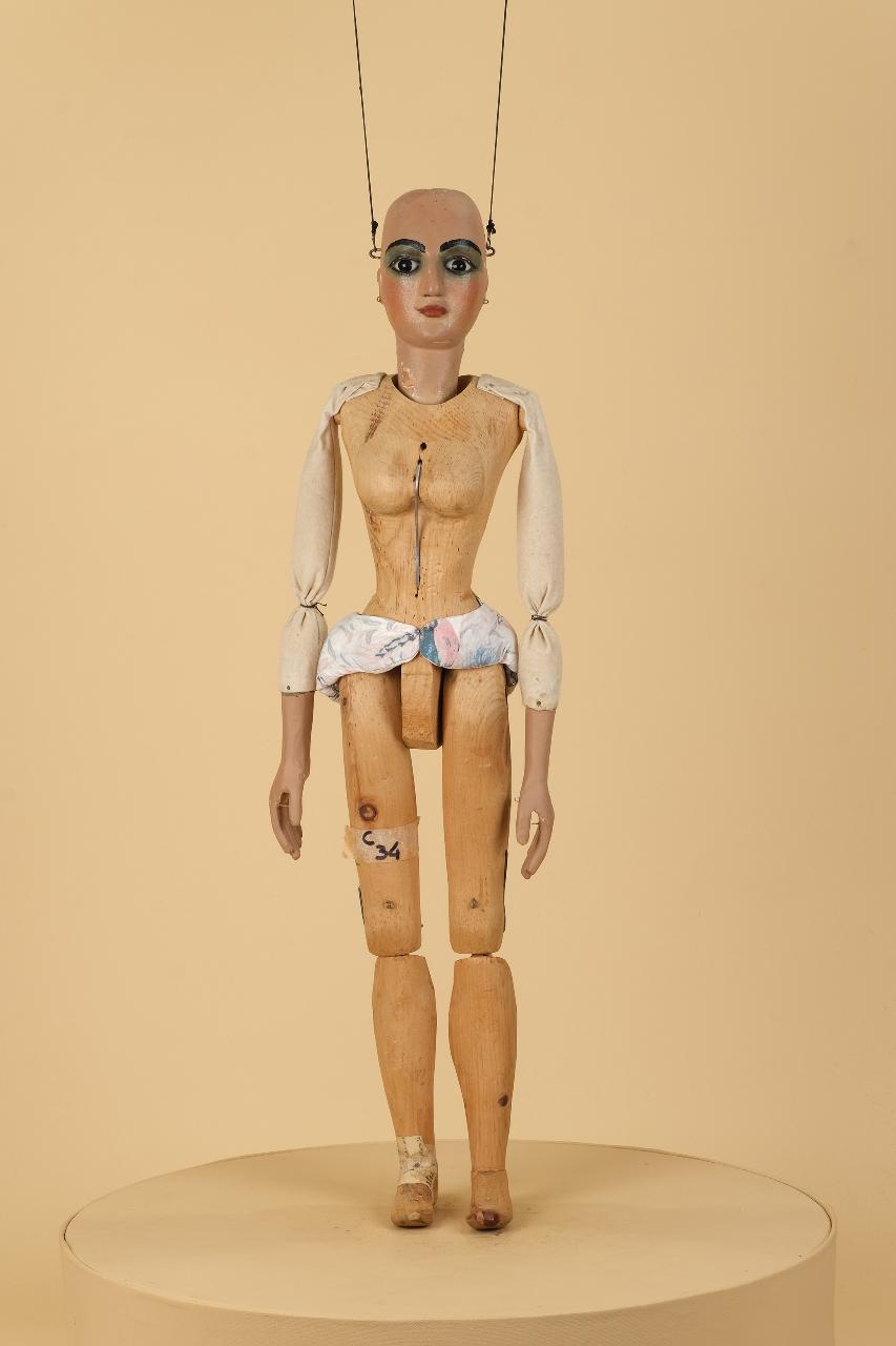 Testa in legno di tiglio fissata al corpo tramite ferro; occhi di vetro; corpo femminile in cirmolo; gambe attaccate con ferro al bacino; ginocchia ad incastro; piedi piombati; mani in tiglio con dita unite. Piedi fissi. Bilancino originale da marionetta in coppia, metodo Holden.
